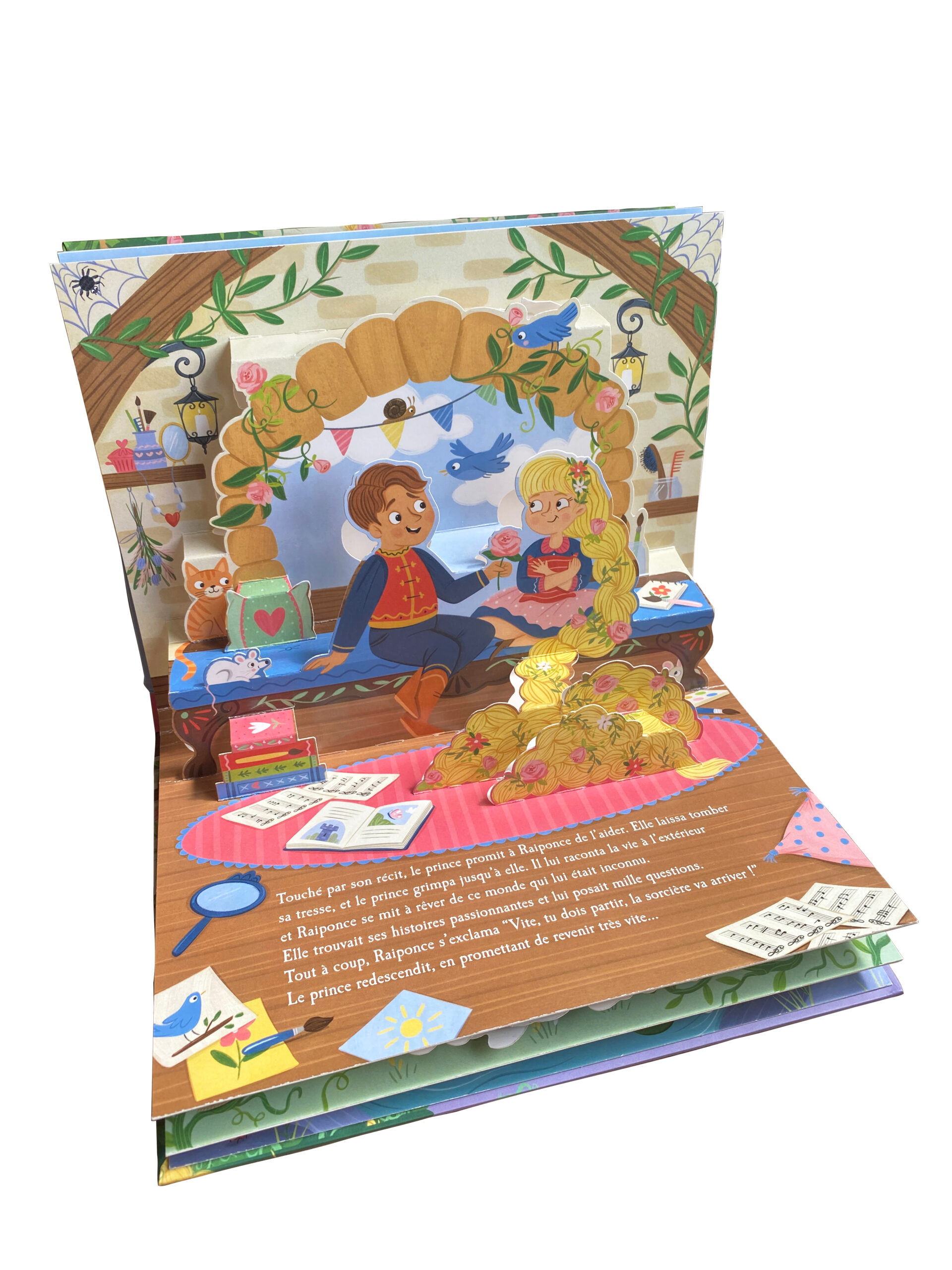Redécouvrez le célèbre conte de Raiponce dans un magnifique livre pop-up plein de poésie et de magie. Il était une fois une petite fille adorée de ses parents, vivant paisiblement dans une charmante chaumière… jusqu’au jour où une sorcière jalouse décida de l’enlever. À travers des mots simples et des illustrations délicates, les enfants suivent l’histoire de Raiponce, enfermée dans sa tour, et vibrent au rythme de ses aventures et de sa rencontre avec le prince.