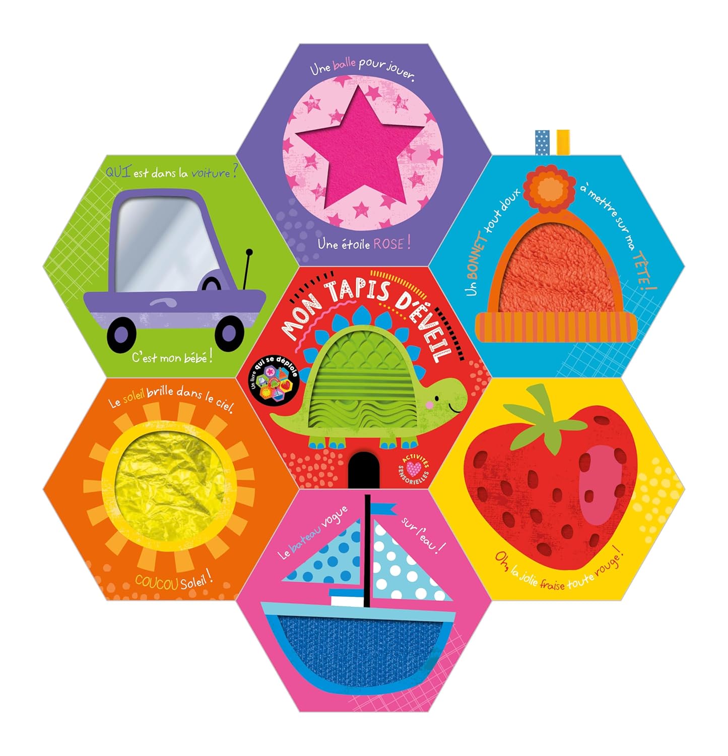 Ce livre tout carton innovant est bien plus qu’un simple ouvrage : il se transforme en un tapis d’éveil captivant pour les tout-petits. Avec sa conception ingénieuse, il se déploie facilement pour offrir un espace de jeu et d’exploration riche en découvertes sensorielles. Ce tapis d’éveil recto/verso propose une variété de textures et de couleurs qui stimulent l’éveil des sens. Les jeunes enfants peuvent explorer 15 surfaces à toucher de grande taille, chacune conçue pour éveiller la curiosité et encourager l’interaction.