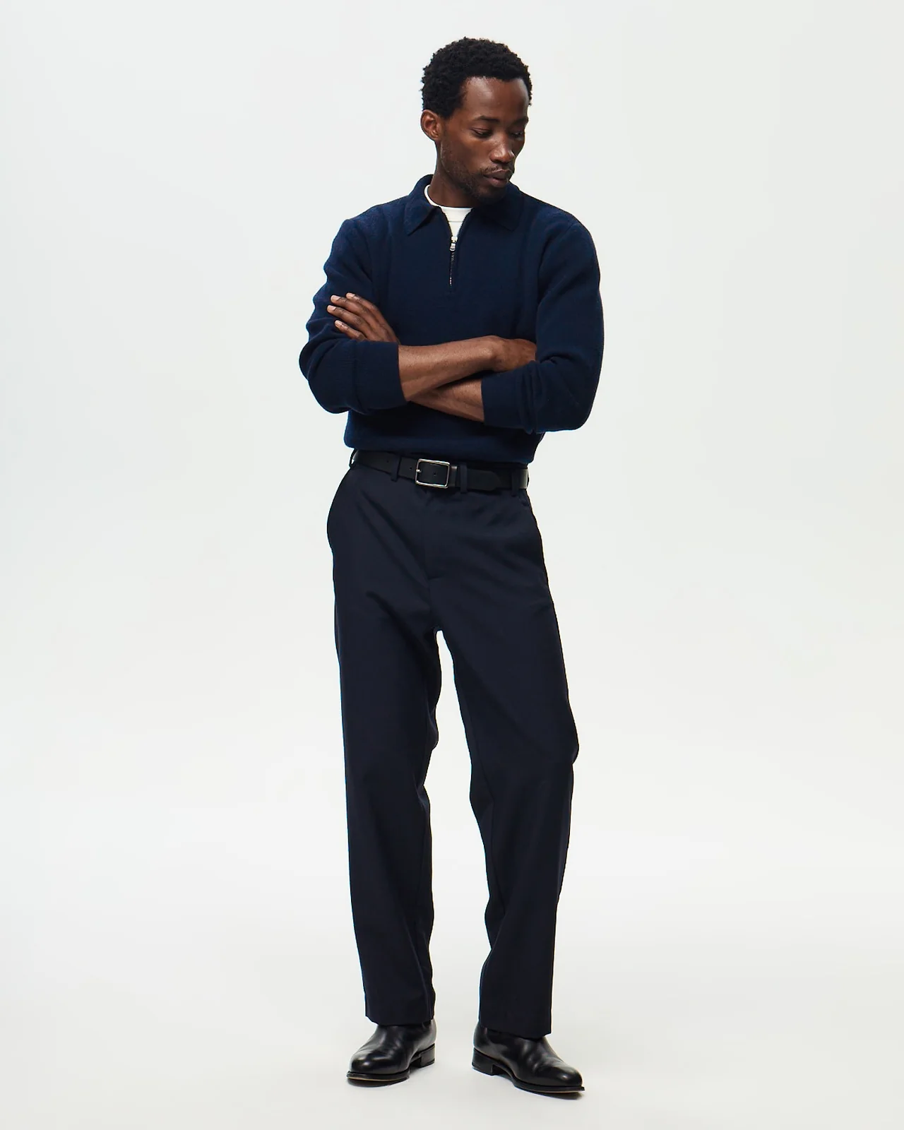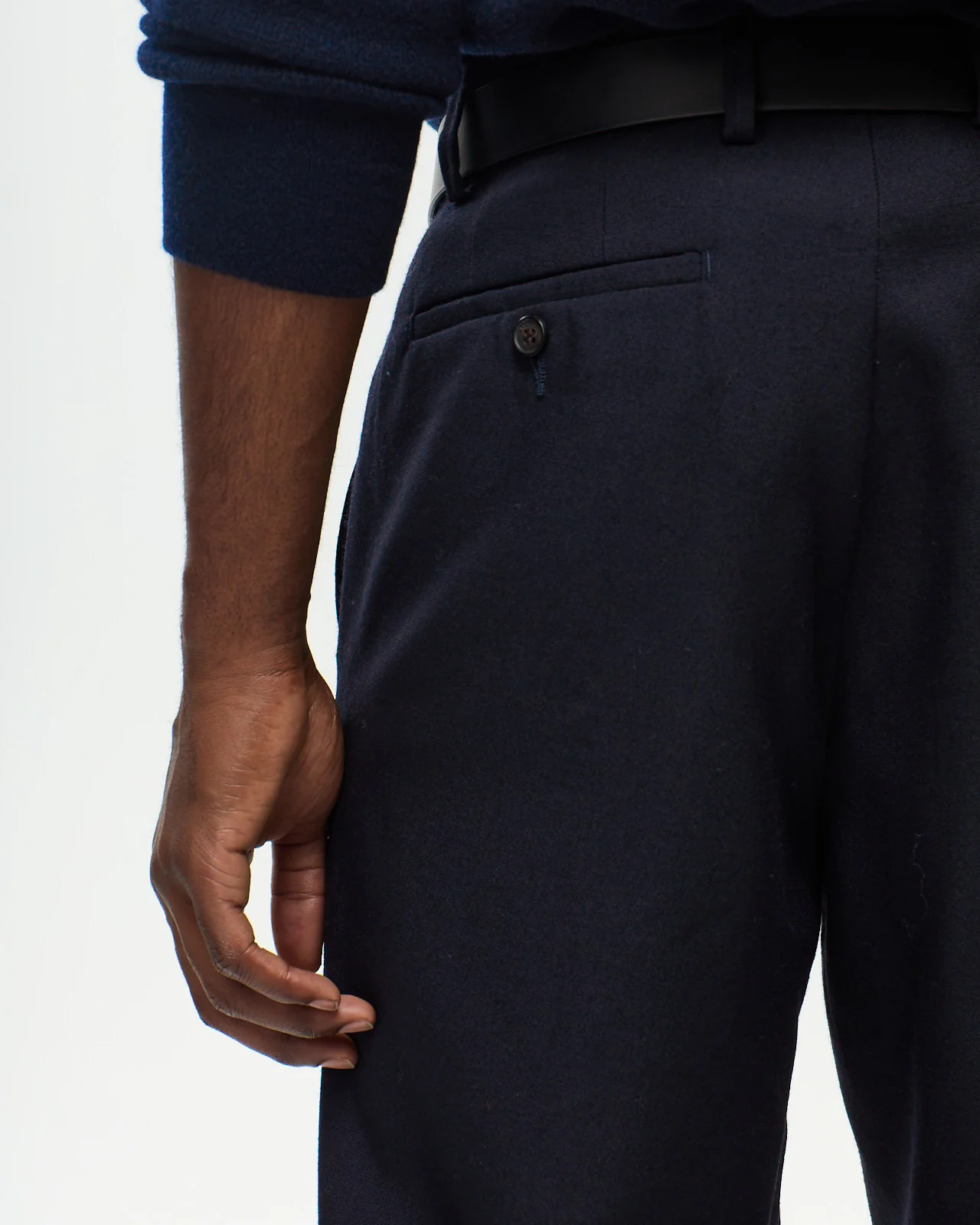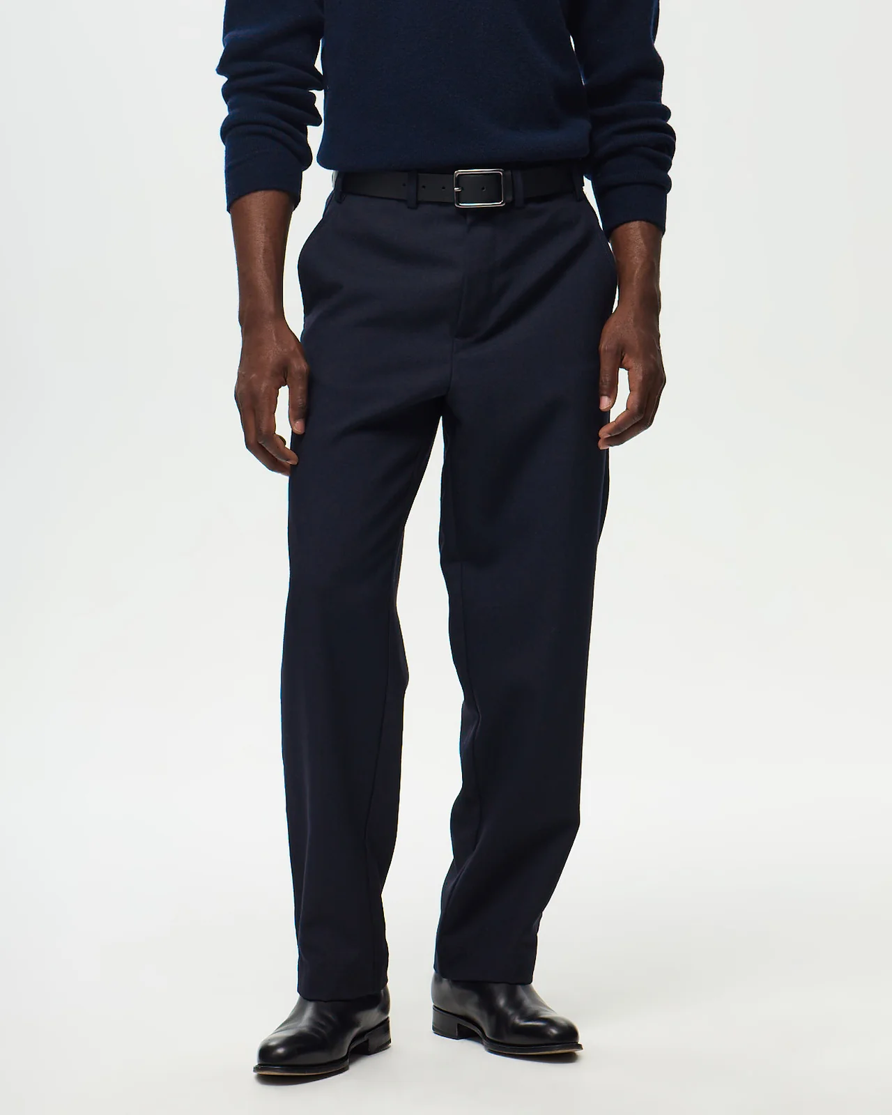 Le chino tailoring en laine vierge, l’imparable du vestiaire masculin. Confectionné en laine vierge italienne, ce tissu chaud et résistant est idéal pour l’automne-hiver. Coupe droite épurée pour une silhouette formelle, facile à associer. Poches italiennes et poches dos passepoilées avec bouton. Un coloris navy profond intemporel qui se marie à merveille avec toutes vos pièces. Fabrication tunisienne.