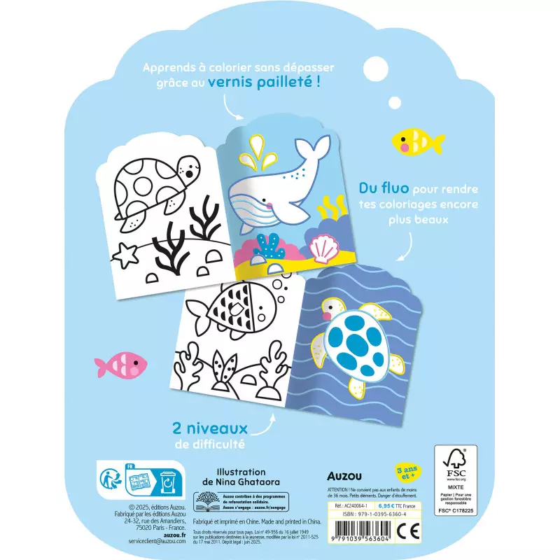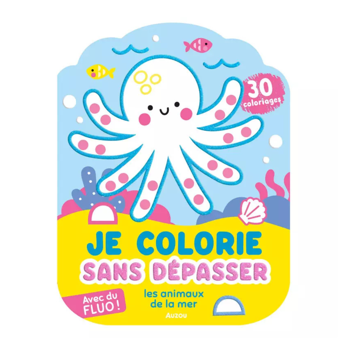 Un carnet de coloriages fluos sur les animaux de la mer, avec deux niveaux de difficulté : un avec vernis à paillettes pour apprendre sans dépasser, et un sans pour laisser parler sa créativité !