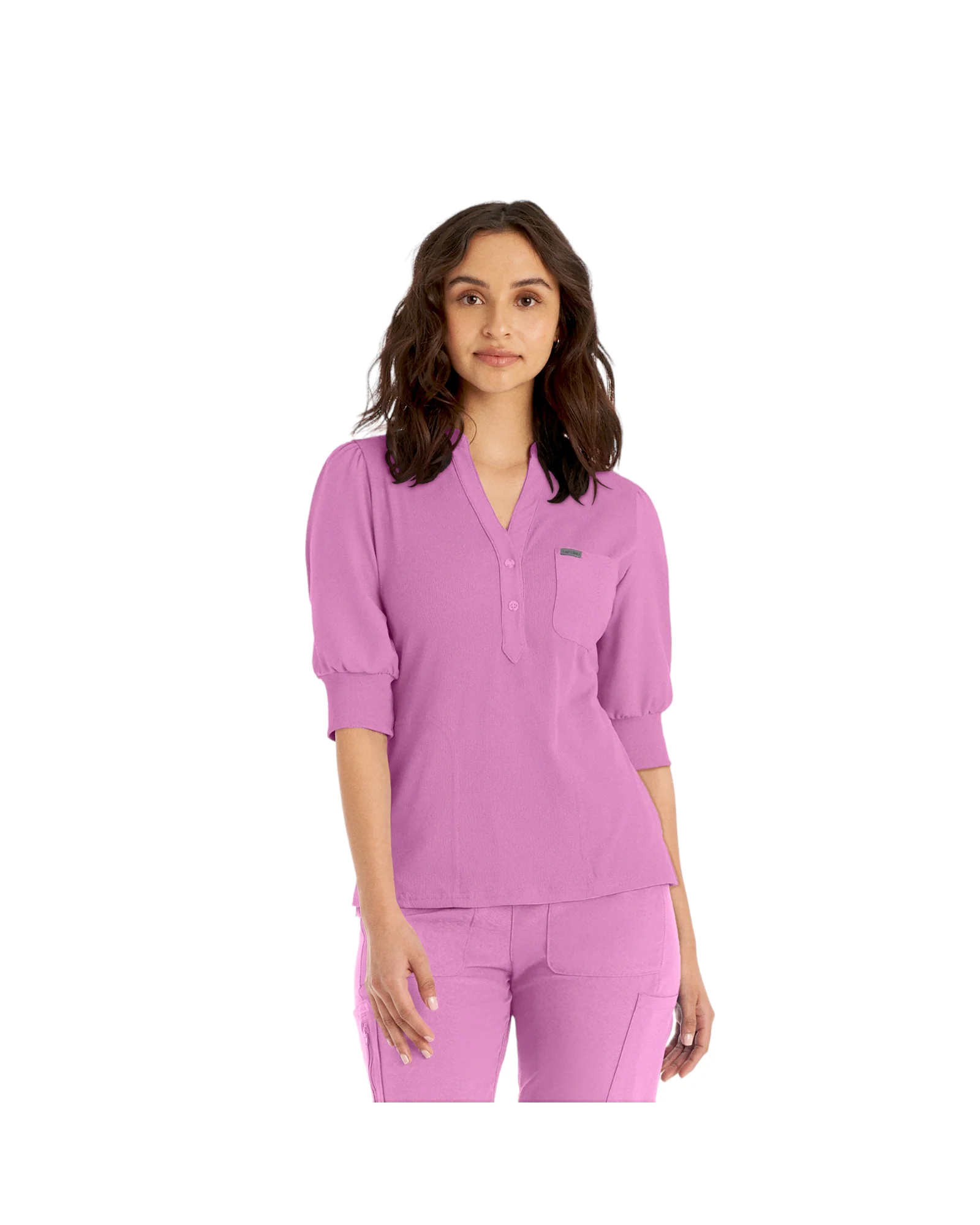 Ce haut à la coupe contemporaine mixte est doté de manches bouffantes et de poignets en tricot côtelé pour plus d’extensibilité et de mobilité. Le corps en tricot côtelé offre un confort de niveau supérieur pendant que vous vous déplacez tout au long de la journée. Il est doté d’une fausse patte de boutonnage, de fentes latérales, d’une poche sur la poitrine et de deux poches passepoilées sur les côtés pour ranger tous les articles dont vous pourriez avoir besoin.