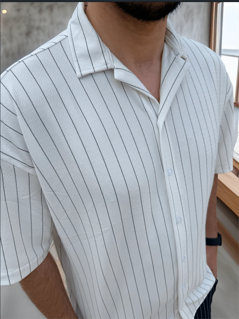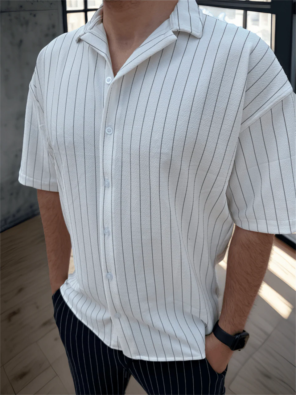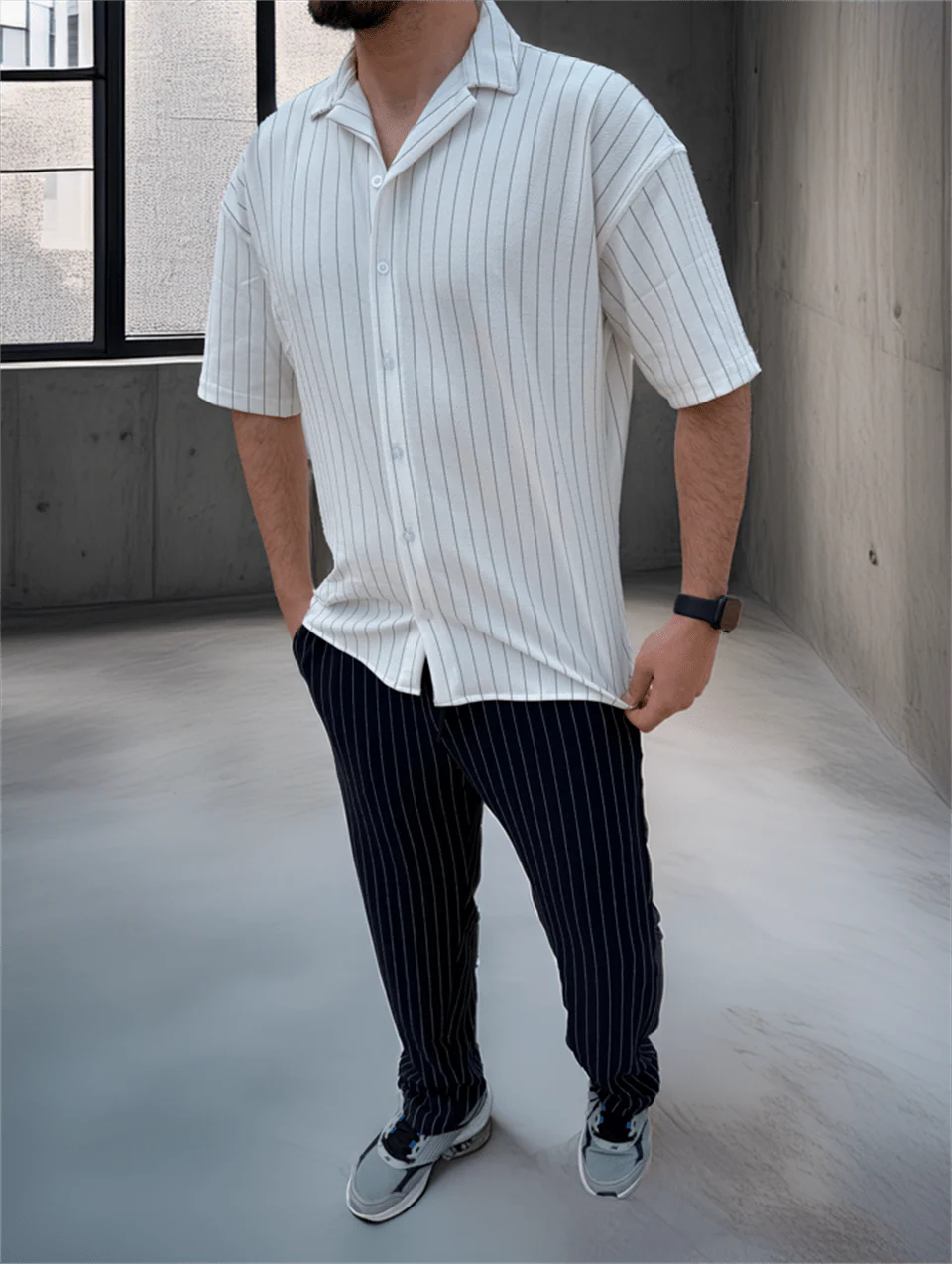 Chemise homme à col apaïs avec un motif moderne à lignes et une matière légère, parfaite pour les saisons plus chaudes et les styles casual chic. Sa coupe semi‑oversize combine confort et allure contemporaine, idéale pour les tenues de tous les jours comme pour les occasions plus élégantes.