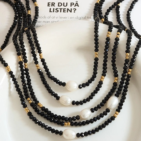 - Matériaux : Perle d’eau douce, acier inoxydable et perles de verre noir
