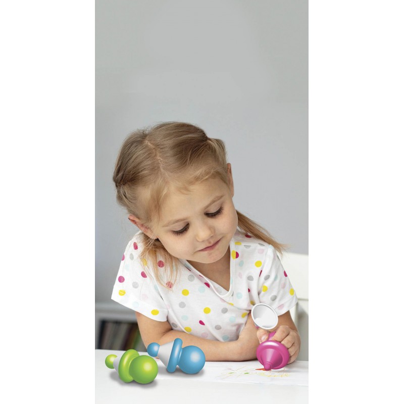 Chaque feutre est équipé d’un capuchon sécurisé. Celui-ci ne peut être ouvert que par un adulte, empêchant ainsi les enfants de les manipuler seuls et réduisant tout risque lié à une mauvaise utilisation. Pour plus de praticité et de pédagogie, le rappel de couleur présent sur le capuchon permet aux petits d’apprendre à ranger et refermer correctement leurs feutres, transformant ce geste en un petit jeu ludique.