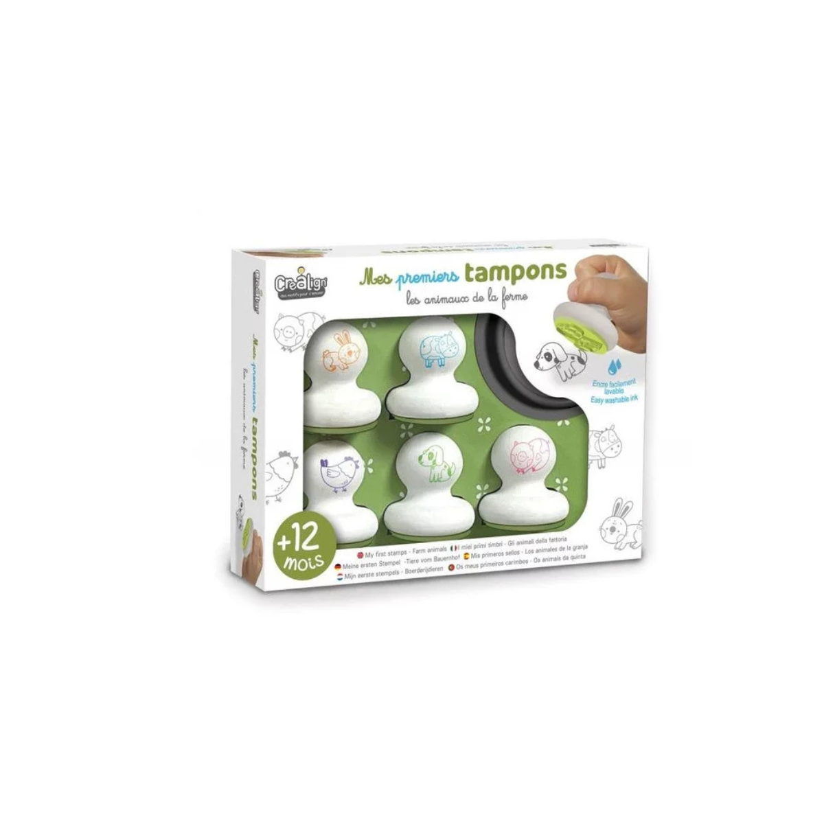 Coffret Mes premiers tampons Animaux de la ferme – Créalign’ Un coffret créatif parfait dès 1 an ! Avec 5 tampons en mousse ergonomiques (lapin, vache, cochon, poule, chien) et un encreur maxi format, votre enfant s’amuse à créer et colorier ses animaux préférés. Faciles à prendre en main et sécurisés, ces tampons développent la motricité et l’imagination des tout-petits. Un jeu d’éveil artistique idéal pour les premières créations !