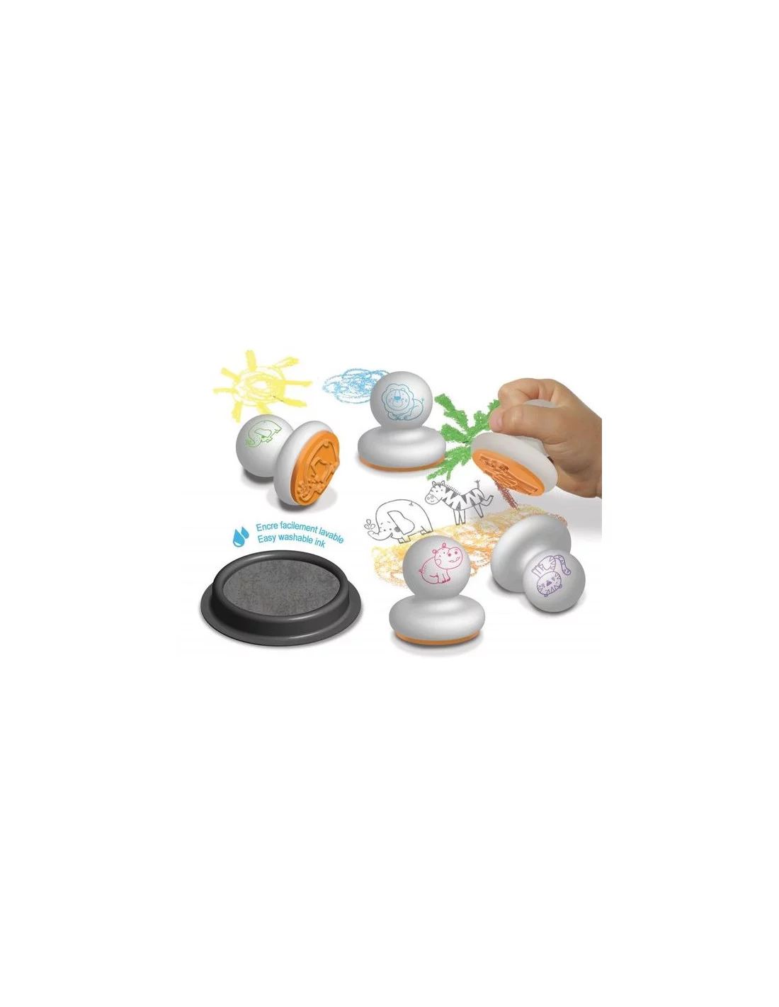 Coffret Mes premiers tampons Animaux de la savane – Créalign’ Un coffret créatif dès 1 an avec 5 tampons en mousse faciles à prendre en main : zèbre, lion, éléphant, tigre et hippopotame. Accompagné d’un encreur maxi format, il permet aux tout-petits de tamponner puis colorier leurs animaux préférés. Ergonomiques et sécurisés, ces tampons développent la motricité et l’imagination des jeunes artistes. Un jeu d’éveil idéal pour les premières créations !
