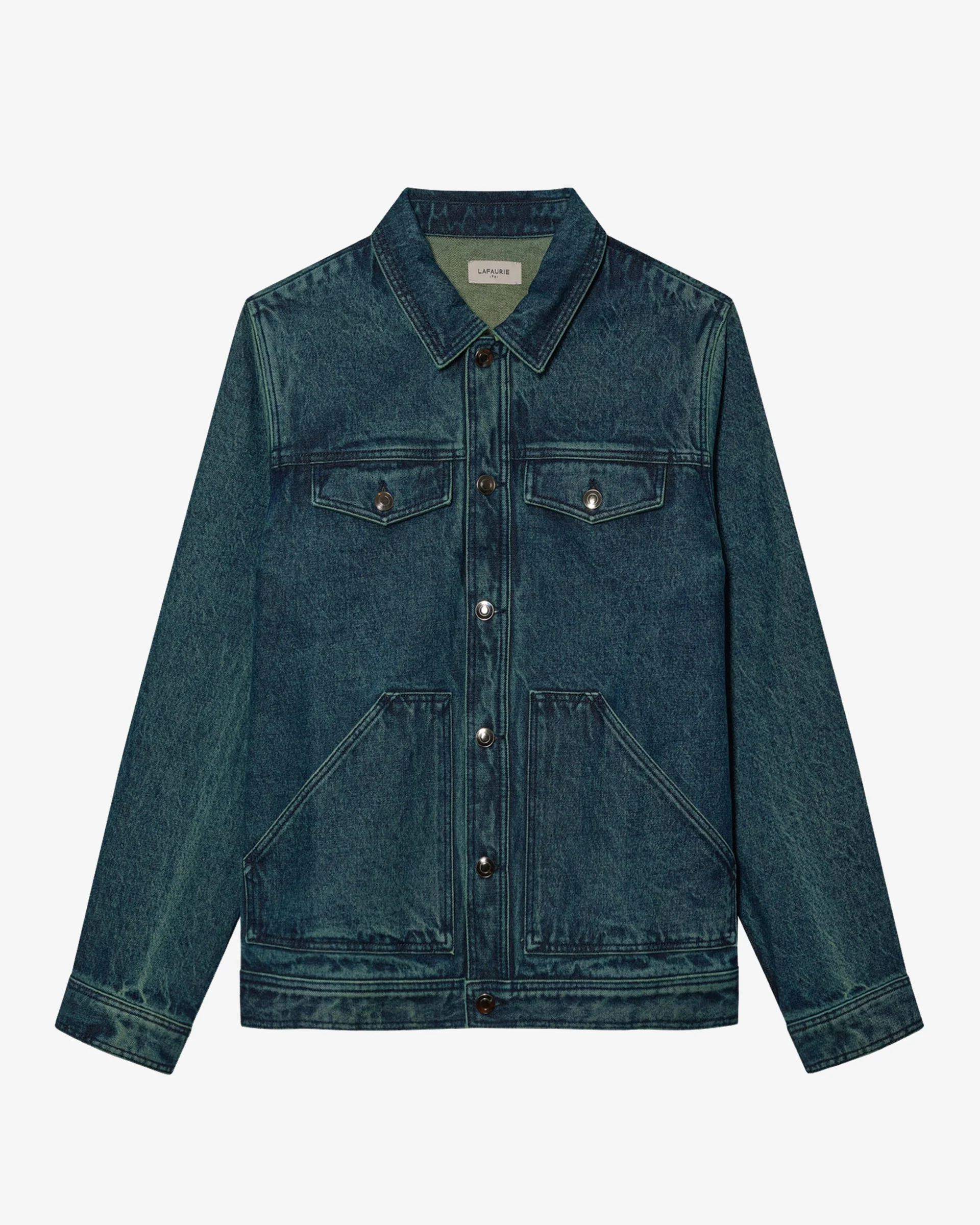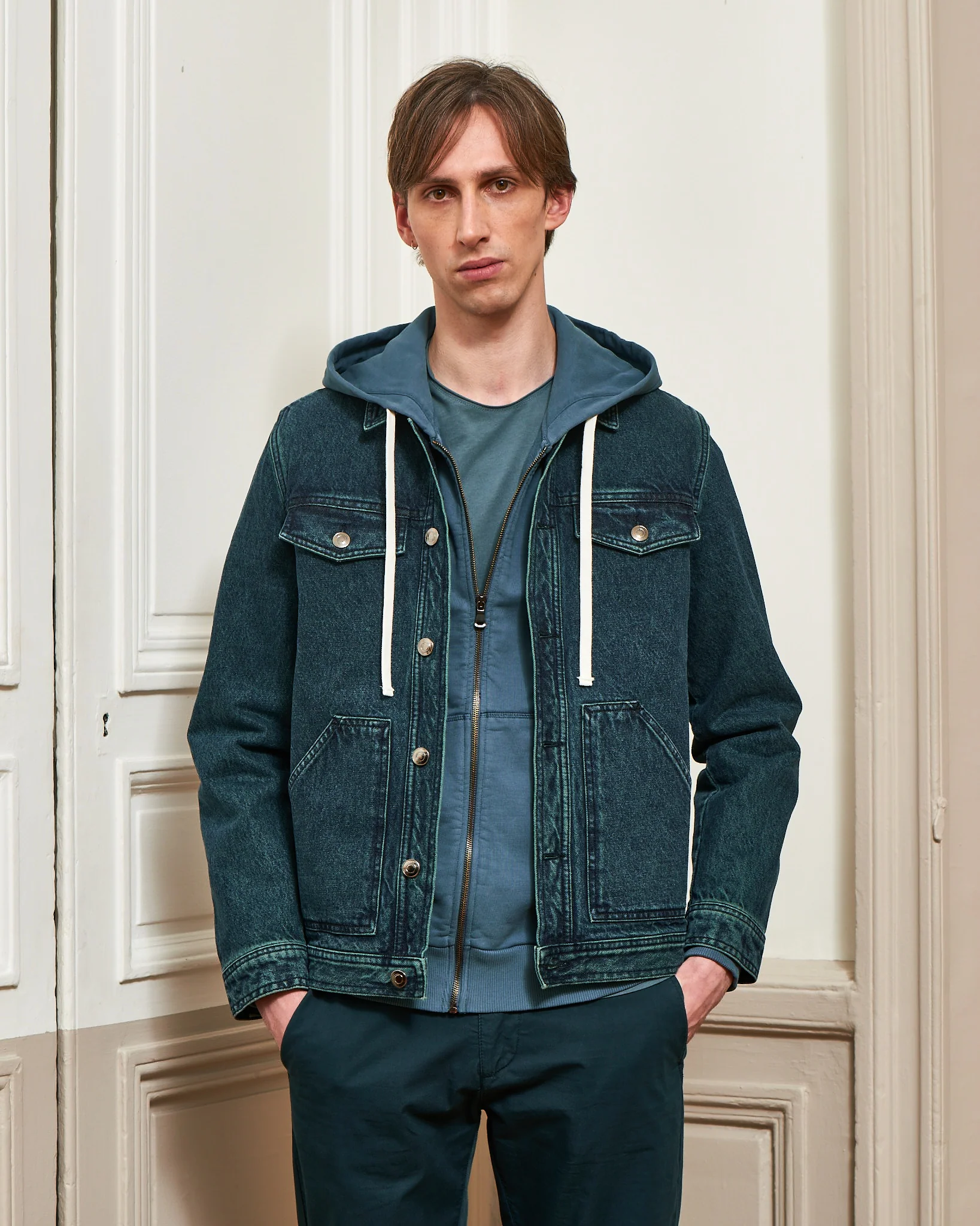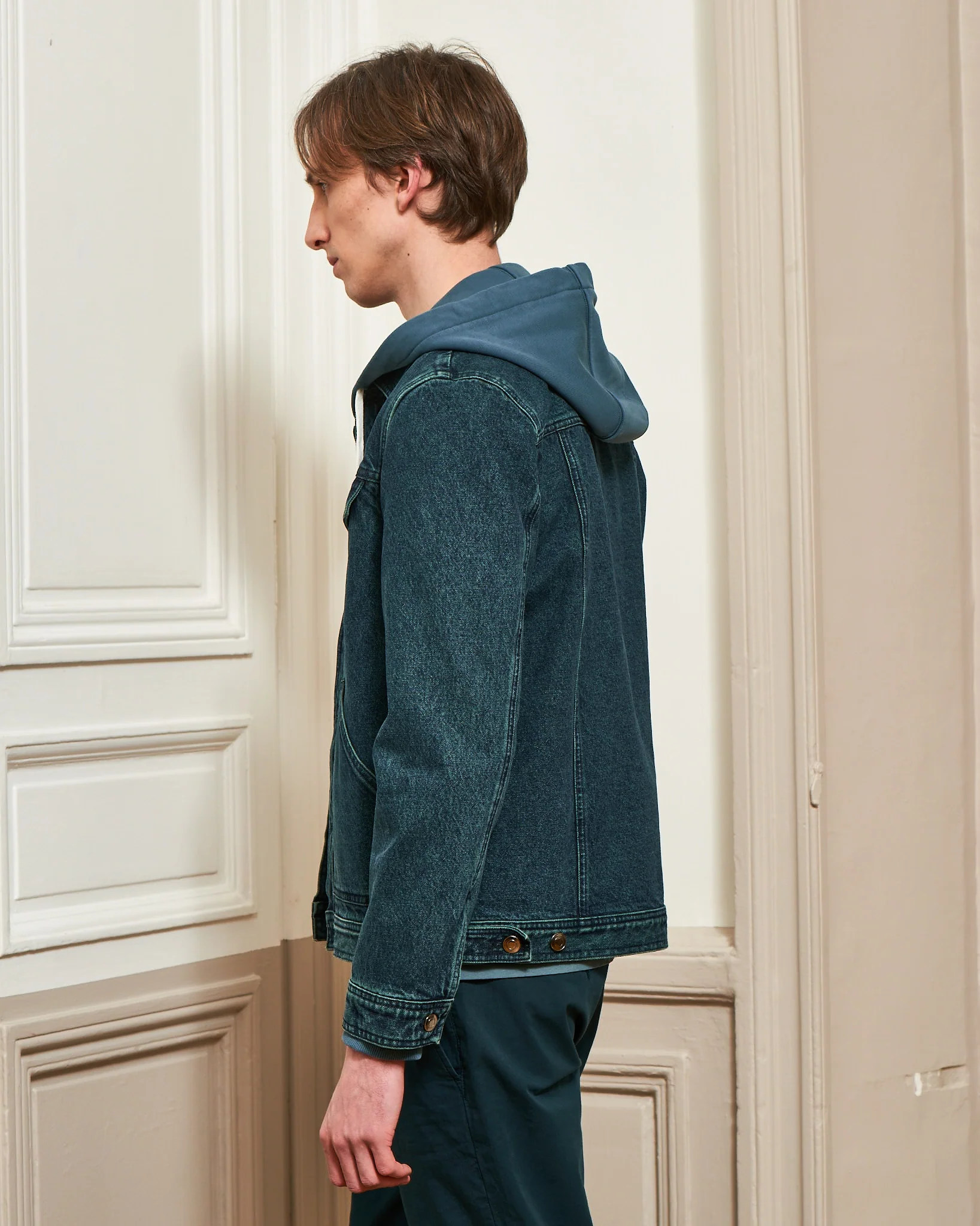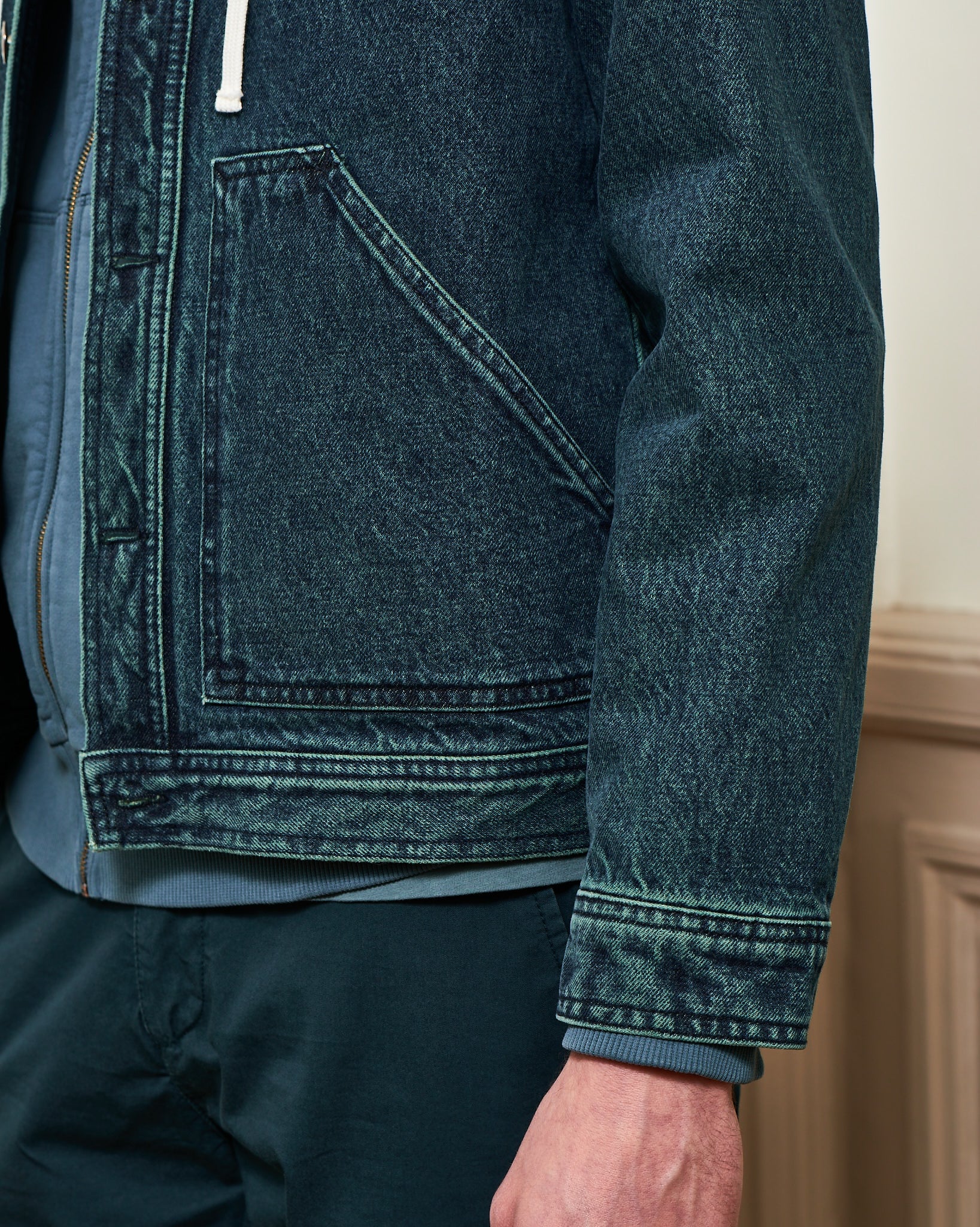 Avec le Degas, nous vous proposons un blouson au porté structuré et au jeu de poches plaquées et à rabats. Il a été confectionné ici dans un denim surteint pour obtenir cette nuance Prusse créée spécifiquement pour Lafaurie. Vous remarquerez ses détails « denim » comme ses boutons et sa patte de serrage en bas de corps.