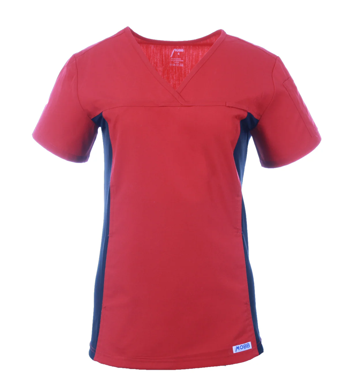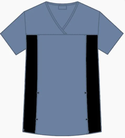 Haut dame à encolure en V classique, panneaux latéraux extensibles. Ce haut a deux poches cachées intérieures et une poche stylo sur la manches gauche.