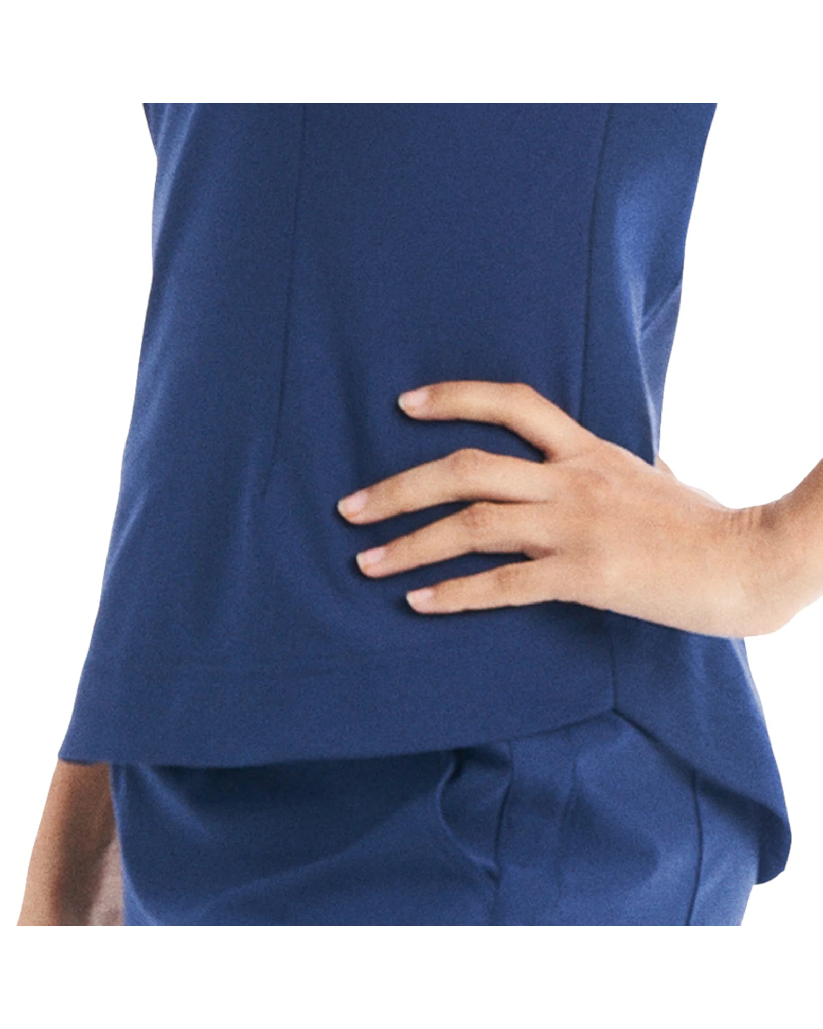 Haut encolure en V de coupe moderne souligne la taille avec des coutures princesse devant et au dos. Un ourlet pan de chemise permet d’enfiler rapidement à l’intérieur du pantalon. Les mancherons et les panneaux de tricot assurent une meilleure souplesse et un confort accru.