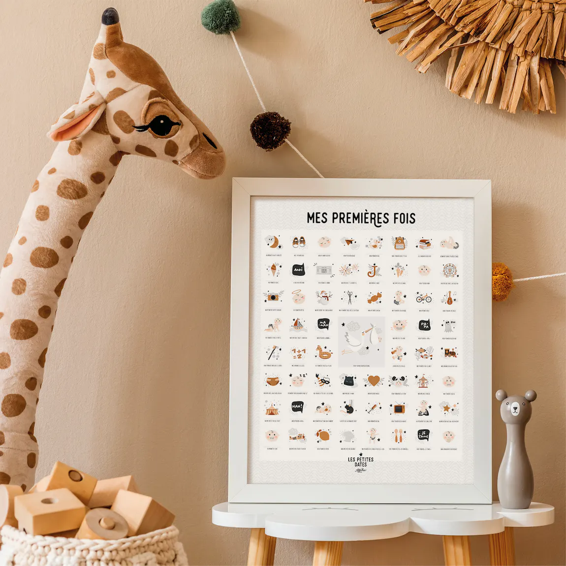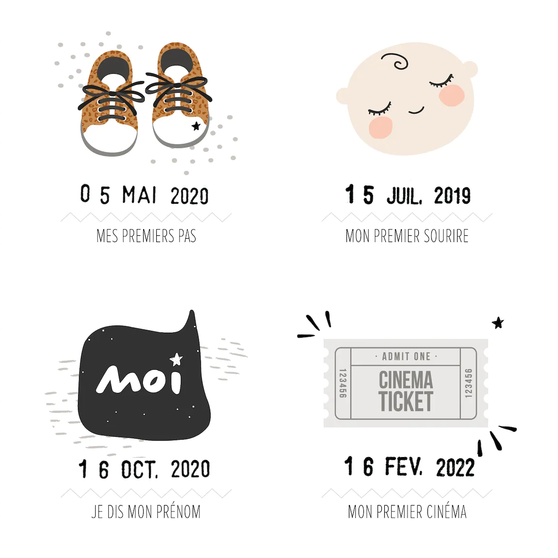 Souvenez-vous des petits moments qui comptent avec cette affiche des premières fois de bébé et son tampon dateur.