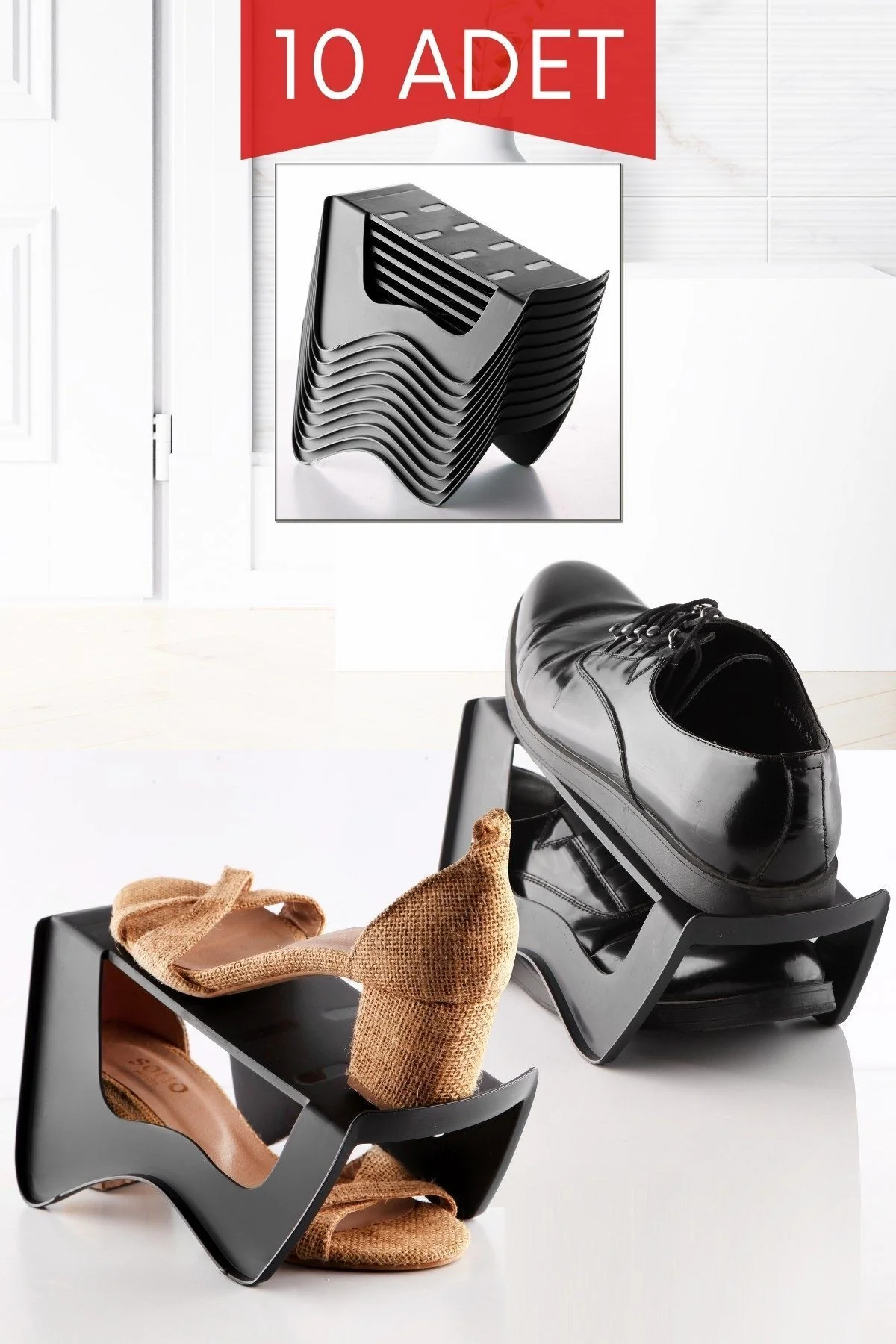 Le lot de 10 rampes pour chaussures est une solution pratique pour organiser vos chaussures dans le placard ou le meuble à chaussures. Chaque rampe est conçue pour vous permettre de ranger une chaussure en bas et une autre au‑dessus, ce qui aide à gagner de l’espace tout en gardant vos chaussures bien ordonnées.