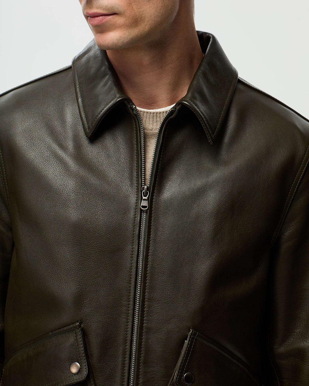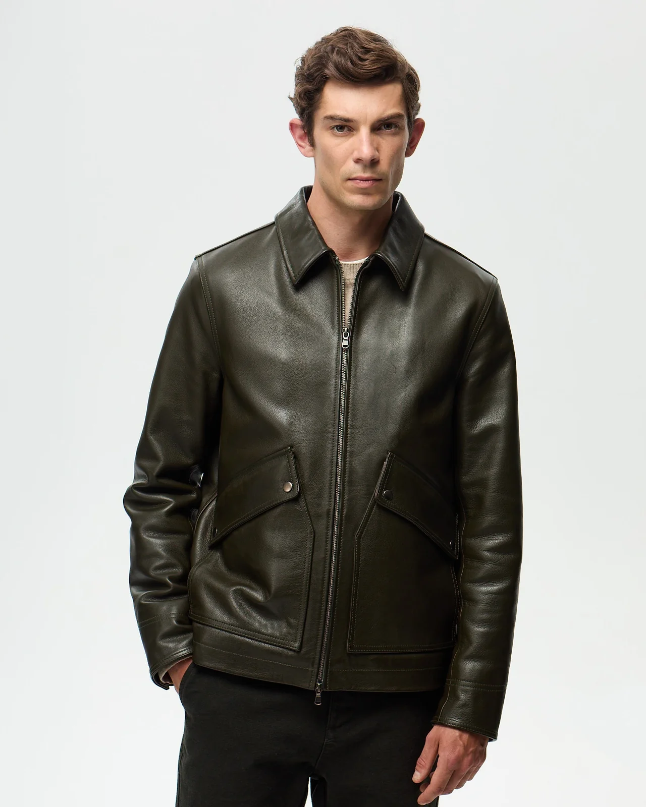 Le blouson en cuir ouatiné d’inspiration militaire revisité avec élégance, taillé dans un cuir marocain de vachette en teinte vert cèdre profonde et originale. Sa coupe droite légèrement ajustée aux lignes nettes évoque l’esprit uniforme, tandis que sa fermeture zippée double curseur finition gun métal s’accompagne de poches plaquées à rabat avec ouverture latérale. Provenance matière et fabrication marocaines d’excellence.