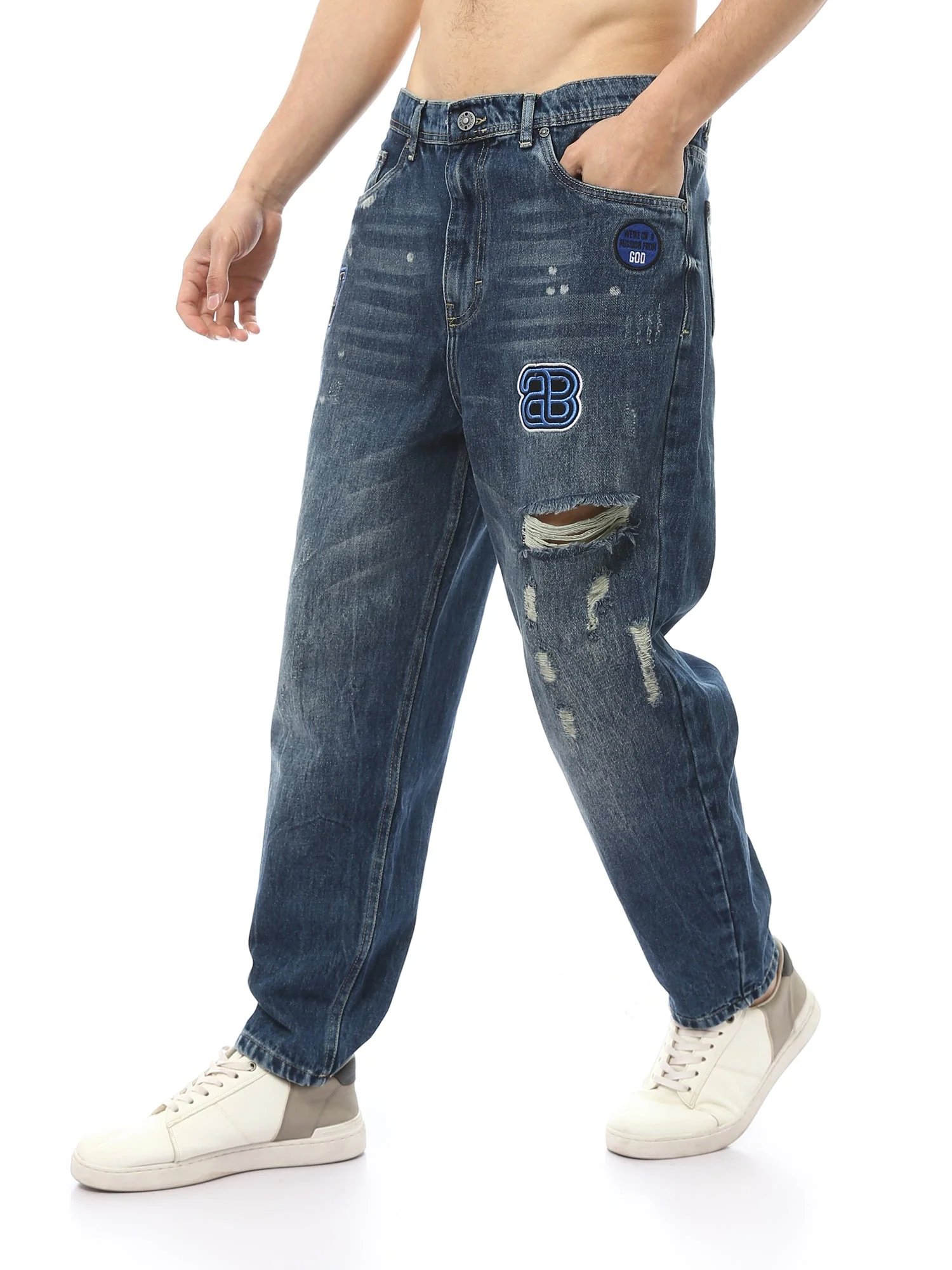 Pantalon en jean pour homme large de couleur bleue, avec des détails de déchirures sur les côtés et des impressions uniques sur les poches avant.Ce pantalon présente un design moderne qui convient à ceux qui aiment les looks décontractés tout en étant élégants. Fabriqué à partir de denim de haute qualité, il assure confort et […]