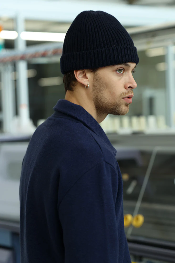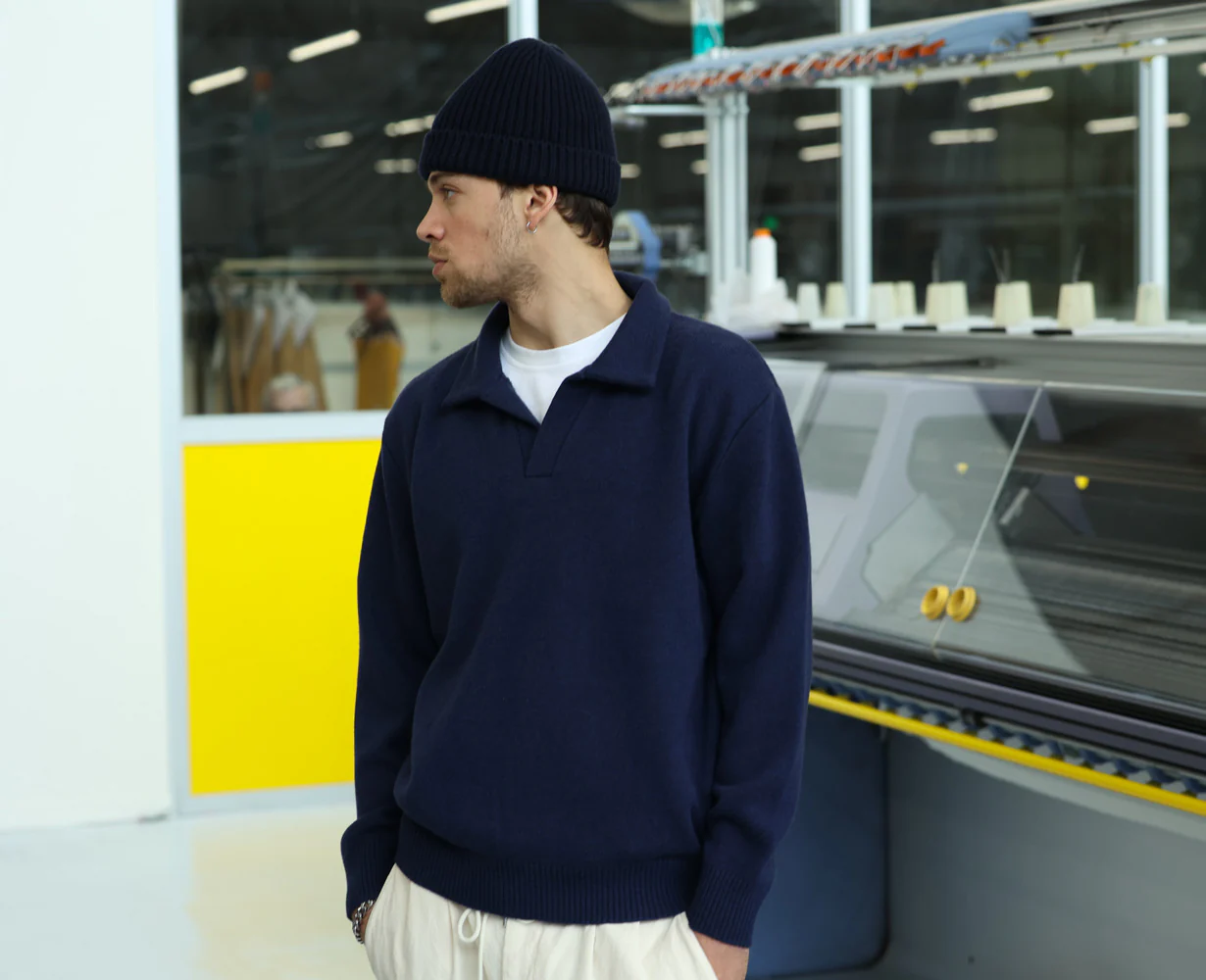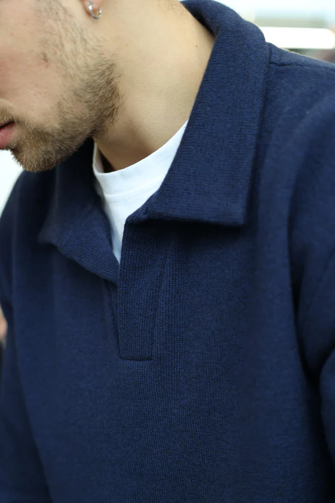 Nous avons repris notre fil du pull Montagne pour créer ce polo intemporel. Dans un coloris marine assez clair.