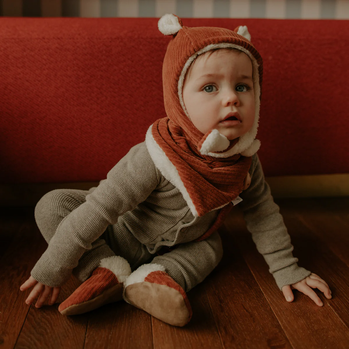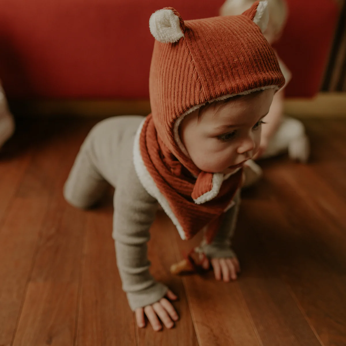 Ce bonnet en velours paprika, fait main, est idéal pour garder bébé bien au chaud cet hiver. Avec son intérieur en teddy doux et hypoallergénique, il allie confort et style. Pratique à attacher sous le menton, il reste bien en place. Conçu avec des matériaux écologiques certifiés OEKO-TEX, il est parfait pour la peau sensible des tout-petits et se complète joliment avec un cache-cou assorti.