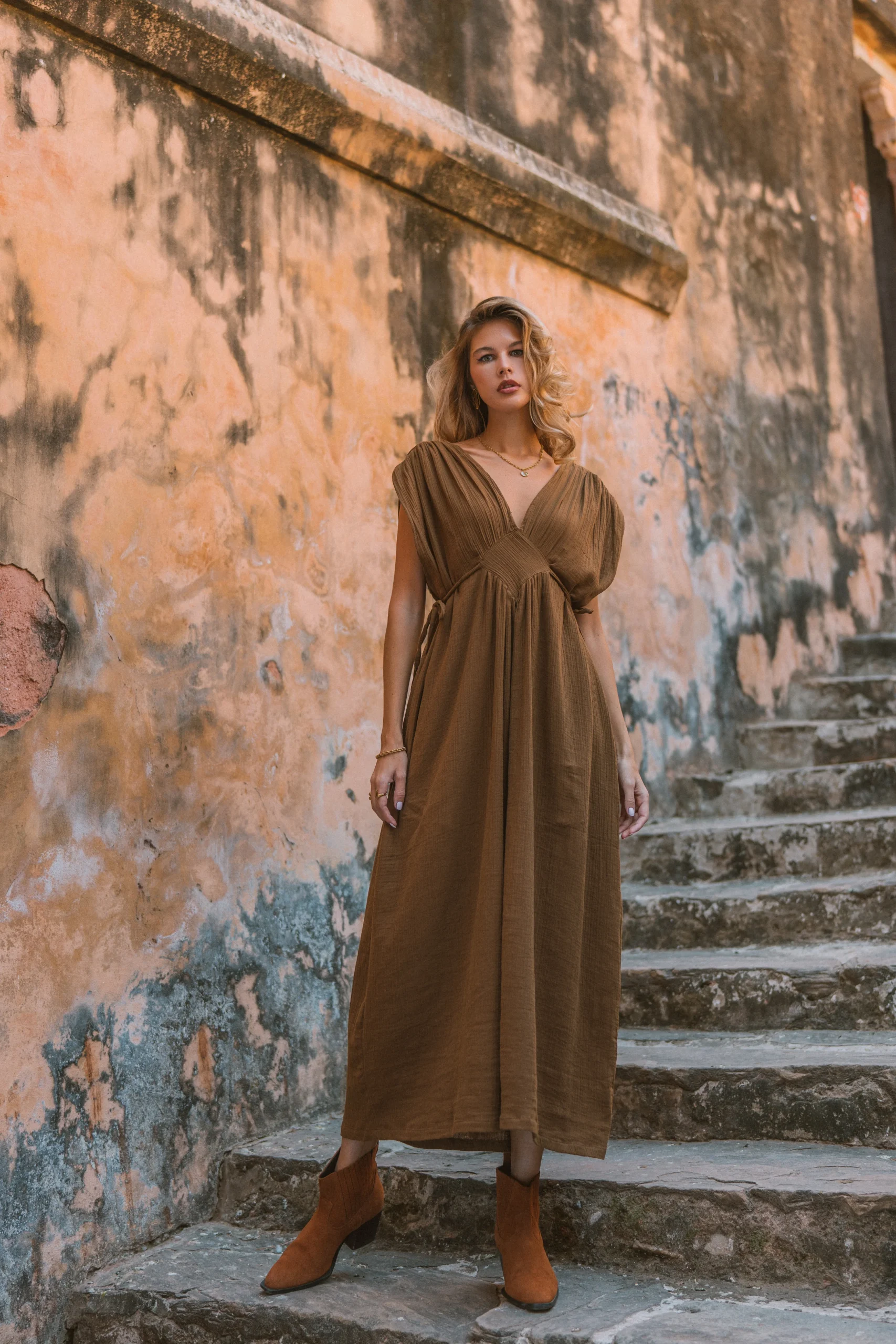100% Coton, tissé à la main. Taille unique, s’ajuste avec des liens sur les cotés pour cintrer. ◦ ँ ◦ Guide de taille Longueur de la robe : 133cmTour de taille max : 134cm