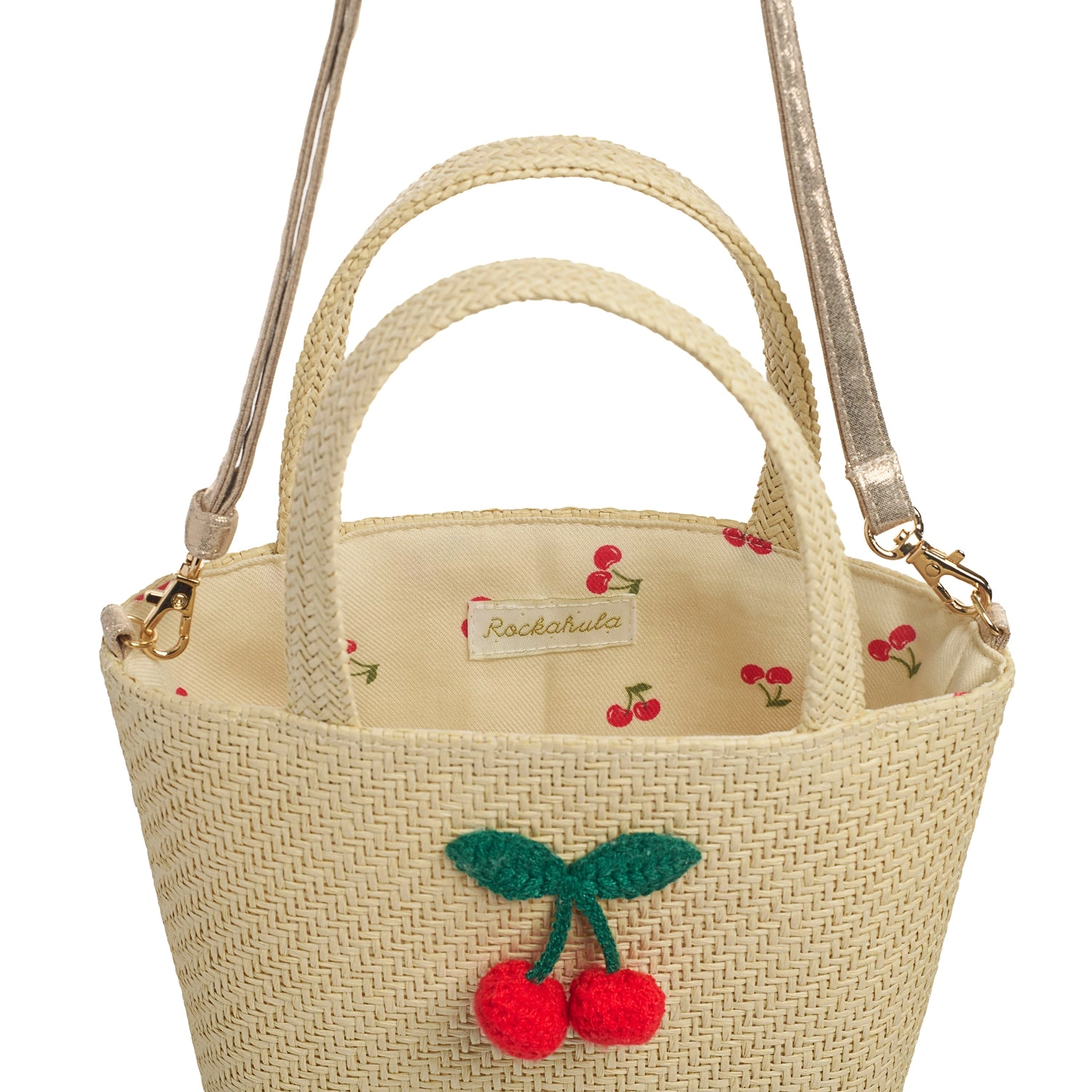 Ce sac panier en raphia tressé est l’accessoire estival parfait. Orné d’une adorable cerise au crochet et entièrement doublé d’un imprimé assorti, il allie charme et praticité. Doté de poignées et d’une bandoulière dorée amovible et réglable, il permet aux petits de le porter comme ils le souhaitent.