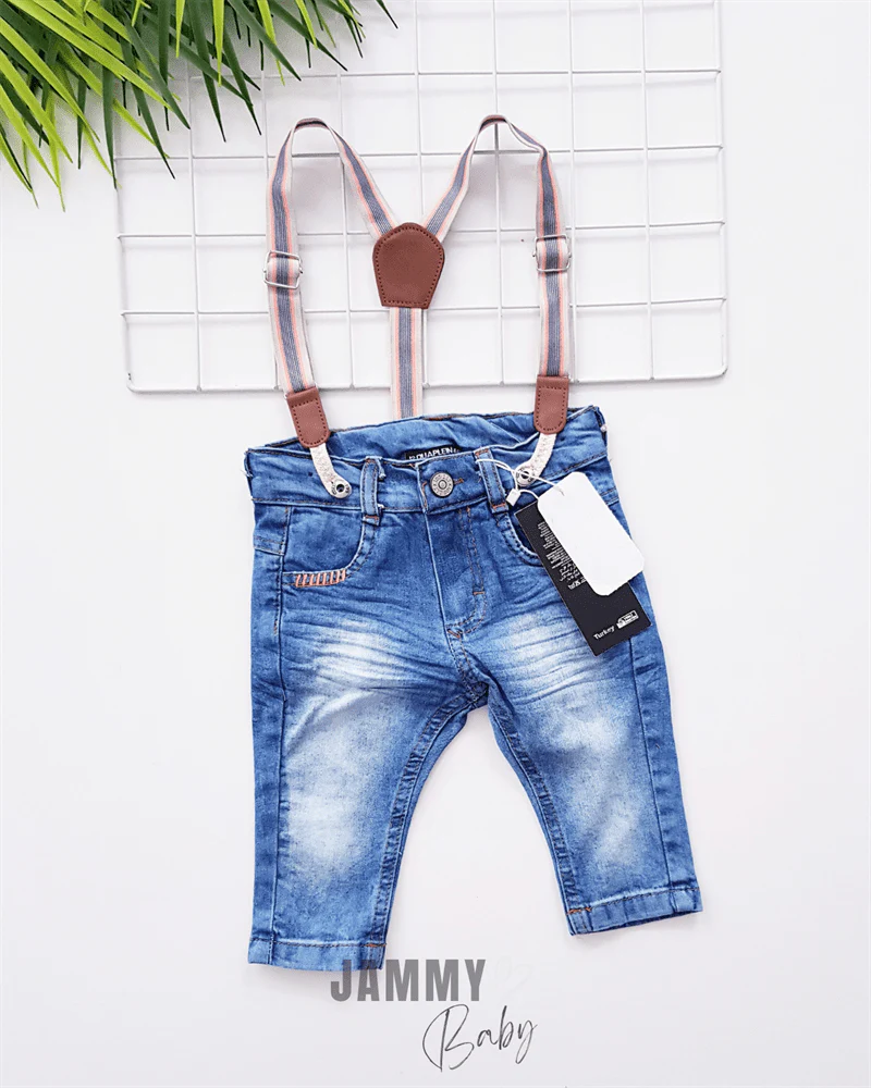 Offrez à votre bébé un look tendance et pratique avec cette salopette en denim de Jammy Baby. Confectionnée en denim doux, elle est équipée de bretelles réglables avec des détails en cuir, ajoutant une touche élégante à la tenue. Le design denim clair et les coutures soignées lui confèrent un style moderne, parfait pour les journées décontractées ou les sorties spéciales.