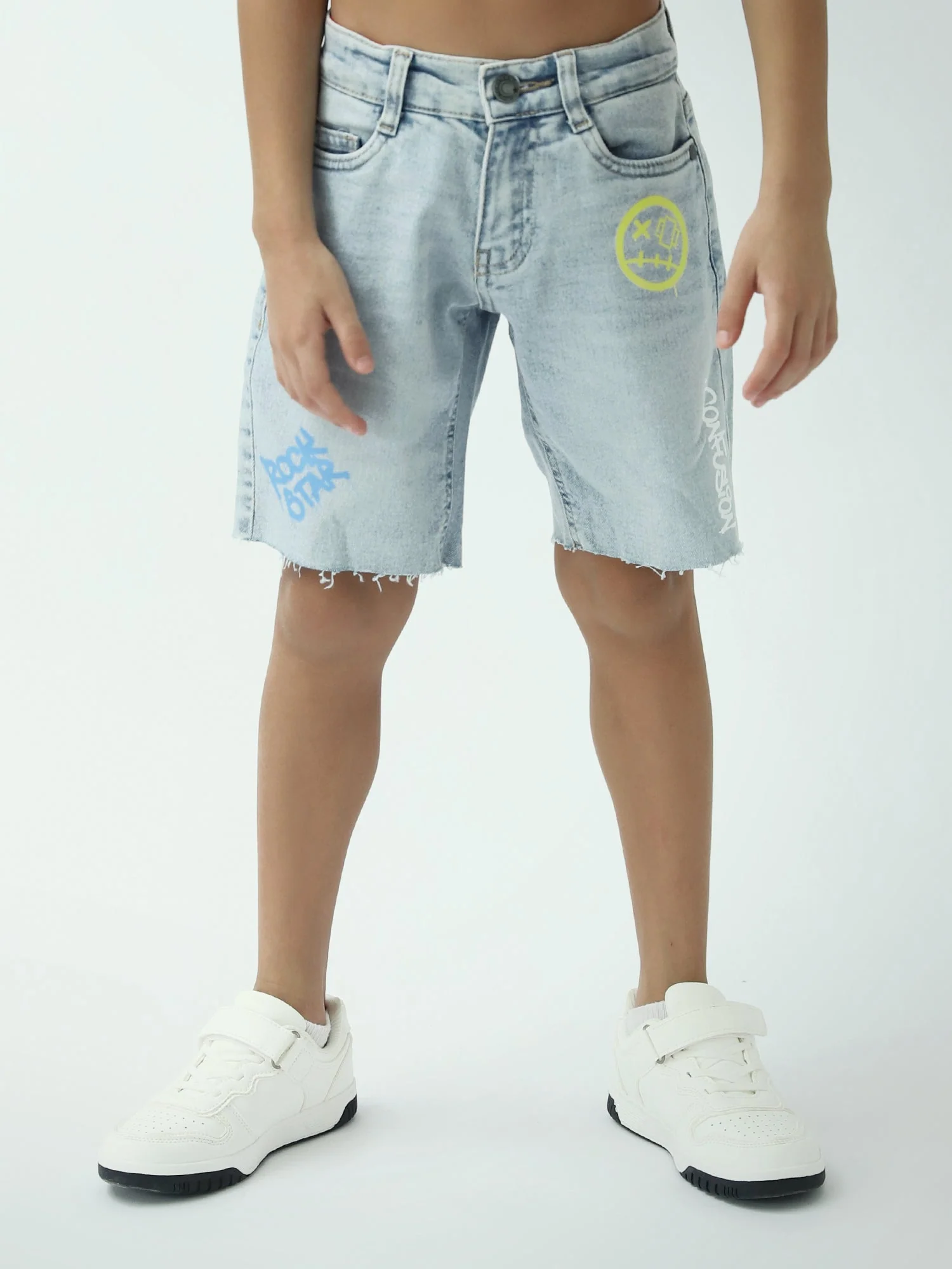 Short en jean garçon bleu clair style graffiti à bords effilochés – SHR24SDPP75432MB1