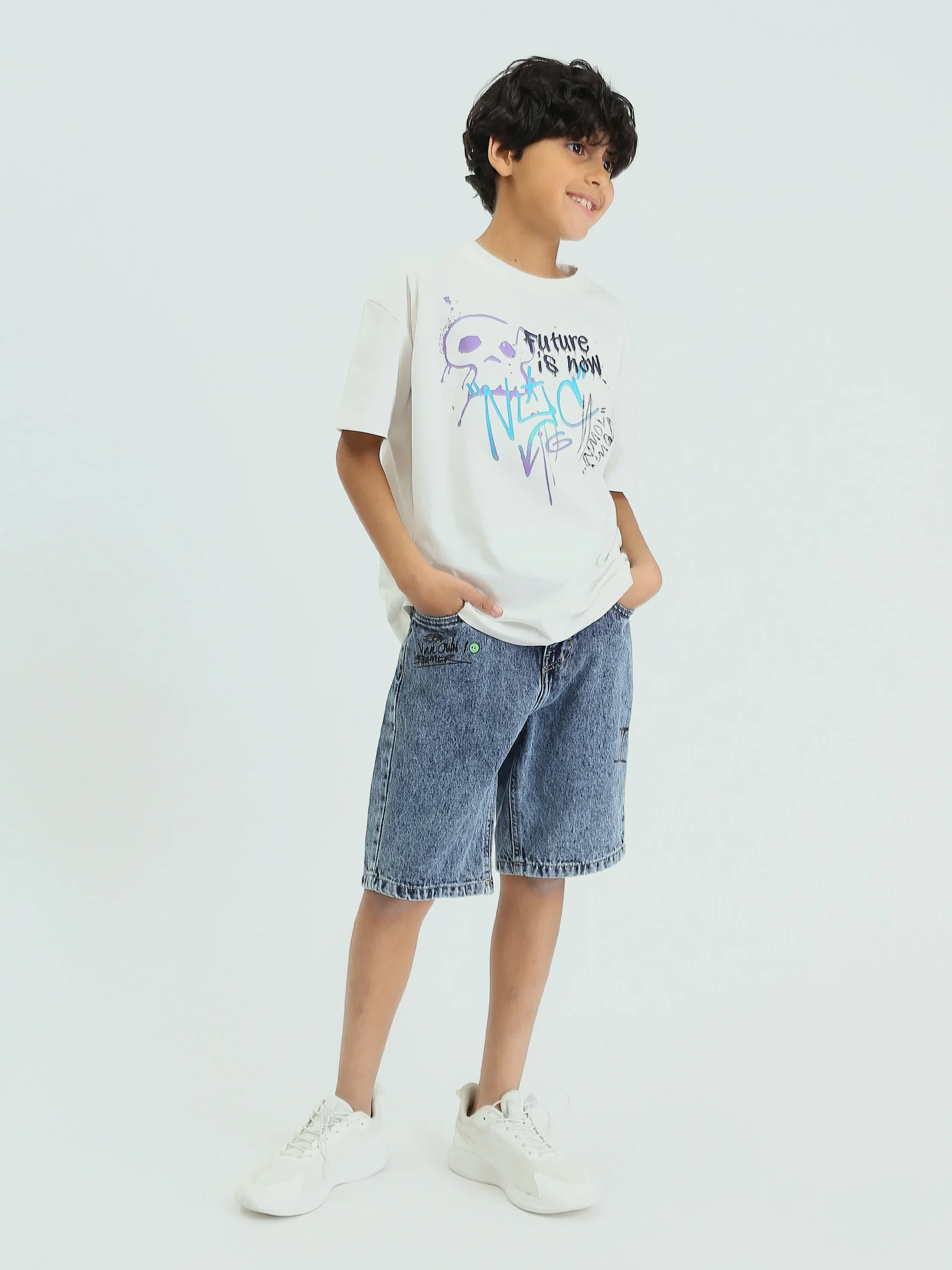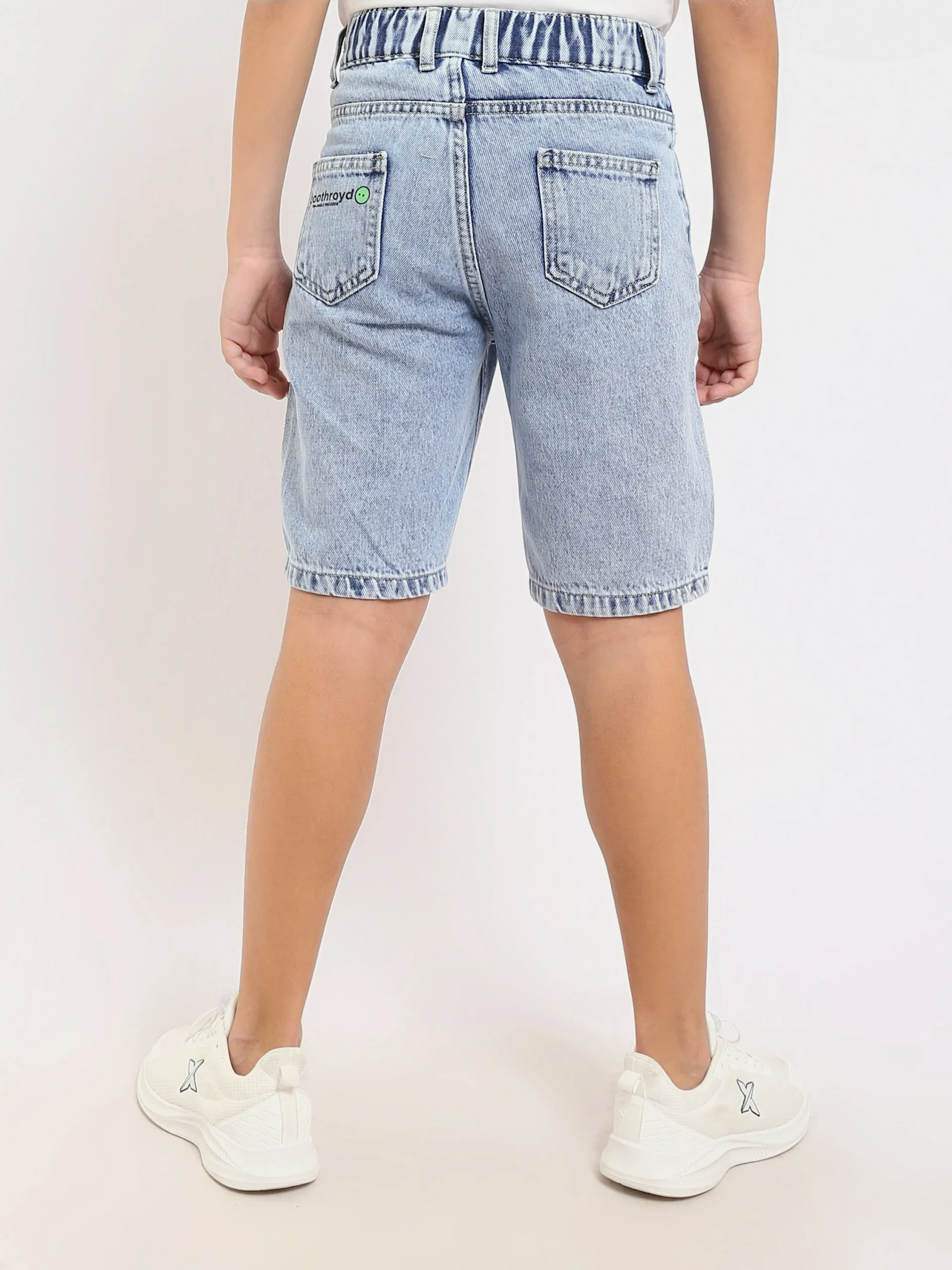 Short en jean pour enfants de couleur bleu clair, au design moderne avec une impression textuelle sur le devant pour ajouter une touche d’originalité.