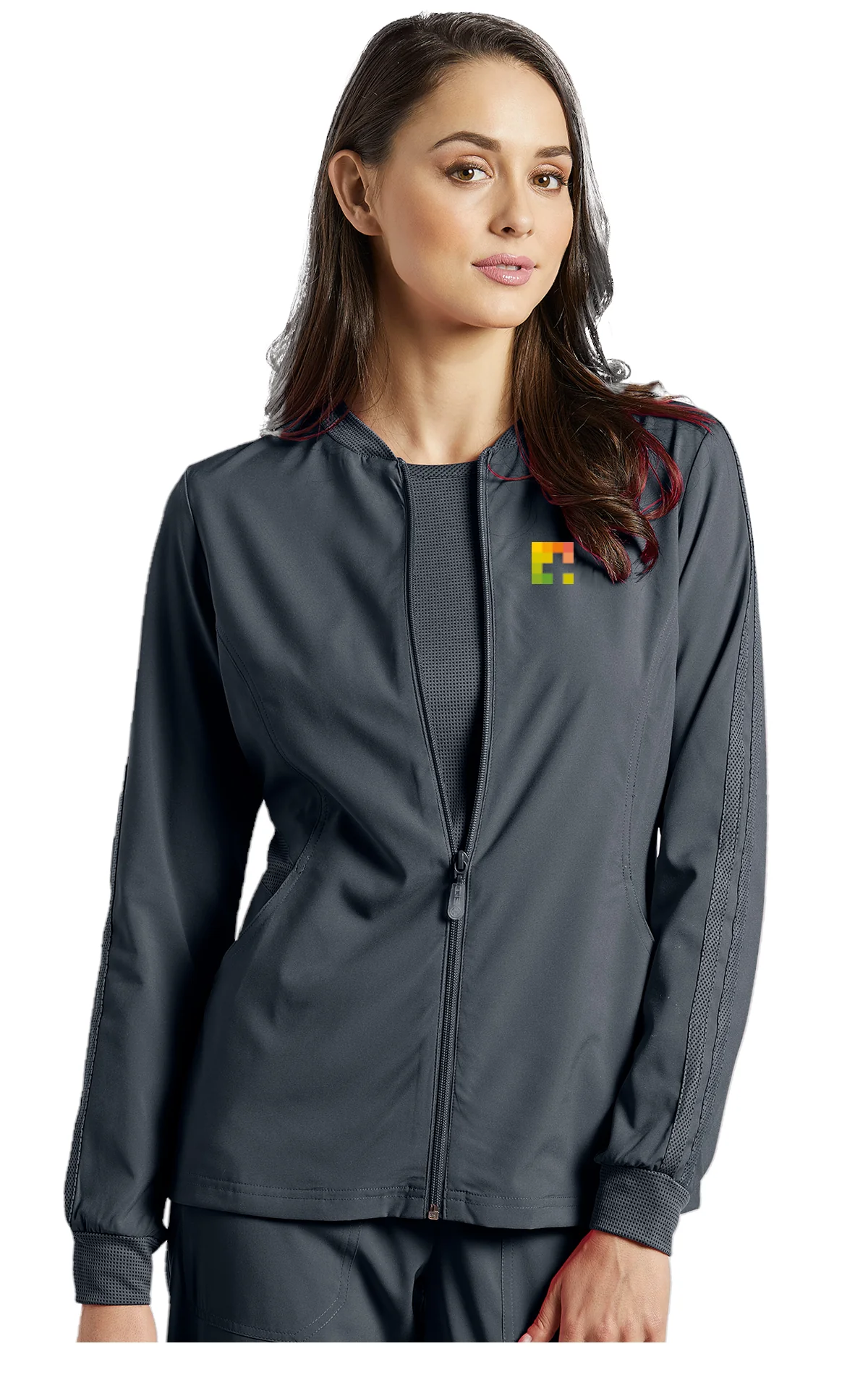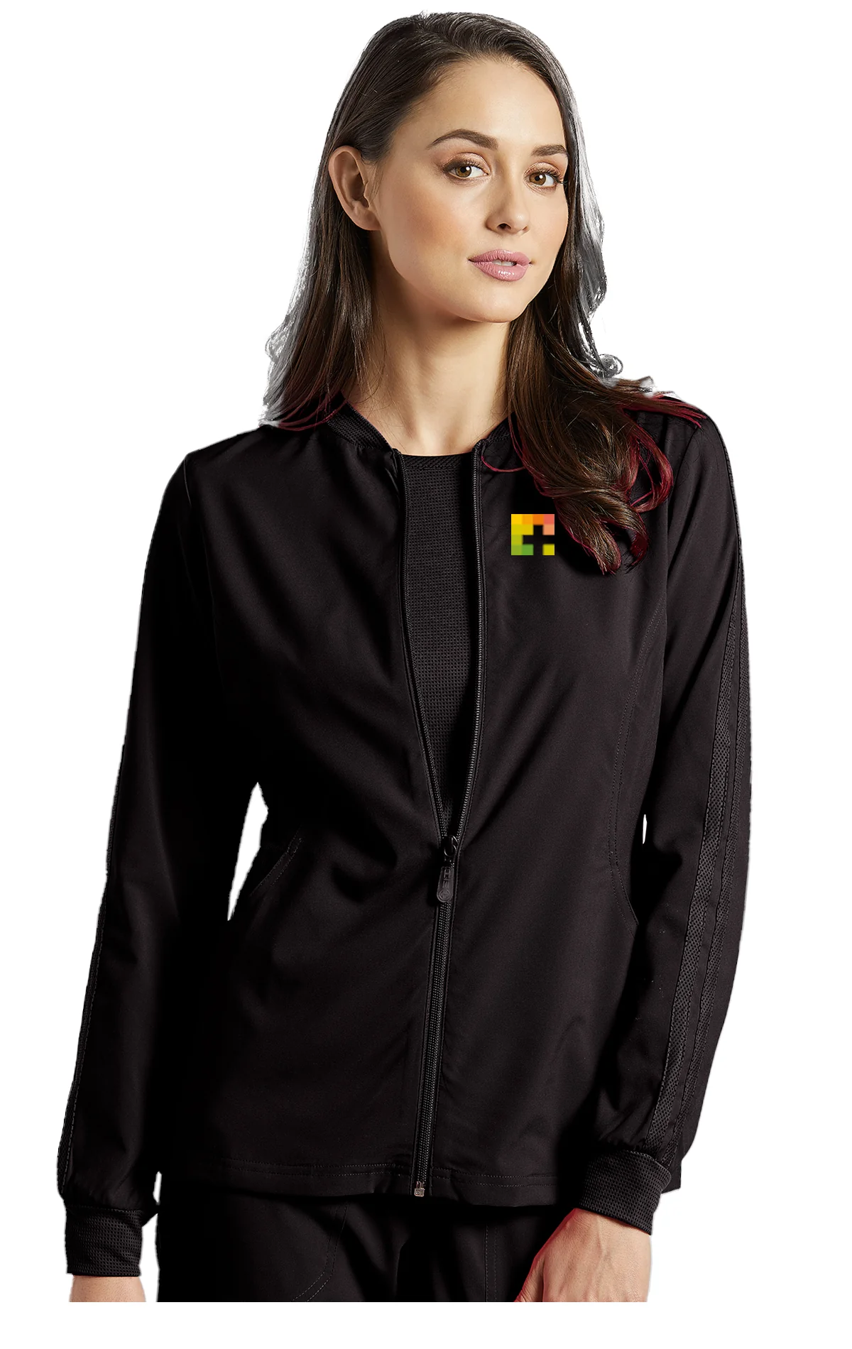 Veste dame FIT de style sportif vous gardera au chaud tout en restant élégante en même temps, deux poches, fermeture éclair, bande de tissu texturé le long de la manche.